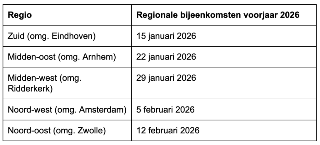 In het voorjaar van 2026 organiseert het Platform netwerkbijeenkomsten in de 5 regio’s van het platform. Onderstaande data zijn eerder al gecommuniceerd. Het gaat telkens om een middagbijeenkomst van 13.30 – 16.15 uur.
